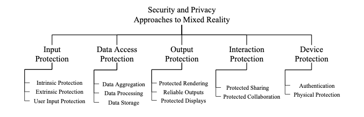 Another risk that widespread adoption of MR technology could potentially pose would be the weakening of data protection systems. It doesn't take much to deduce that the increase in the scope of data types associated with MR could similarly increase the possibility of that data being stolen. The figure below shows the various categories in a mixed reality system, each of which contains fields that could become subject to attack [2].